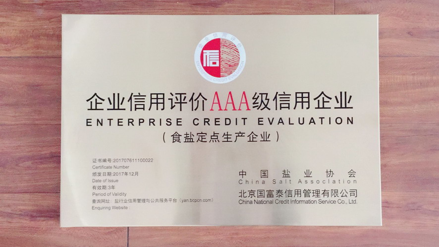 按照主營業(yè)務(wù)收入、利潤、主營業(yè)務(wù)收入利稅率及主營業(yè)務(wù)增速四項指標(biāo)評價,2016年集團(tuán)公司被中國輕工業(yè)聯(lián)合會和中國鹽業(yè)協(xié)會評為中國輕工業(yè)制鹽行業(yè)十強企業(yè)。根據(jù)《社會信用體系建設(shè)規(guī)劃綱要(2014—2020)》,經(jīng)第三方專業(yè)評價機構(gòu)和中國鹽業(yè)企業(yè)信用等級評價委員會審核并向社會公示,2016年江蘇金橋制鹽有限公司被評為AAA級食鹽生產(chǎn)企業(yè)。