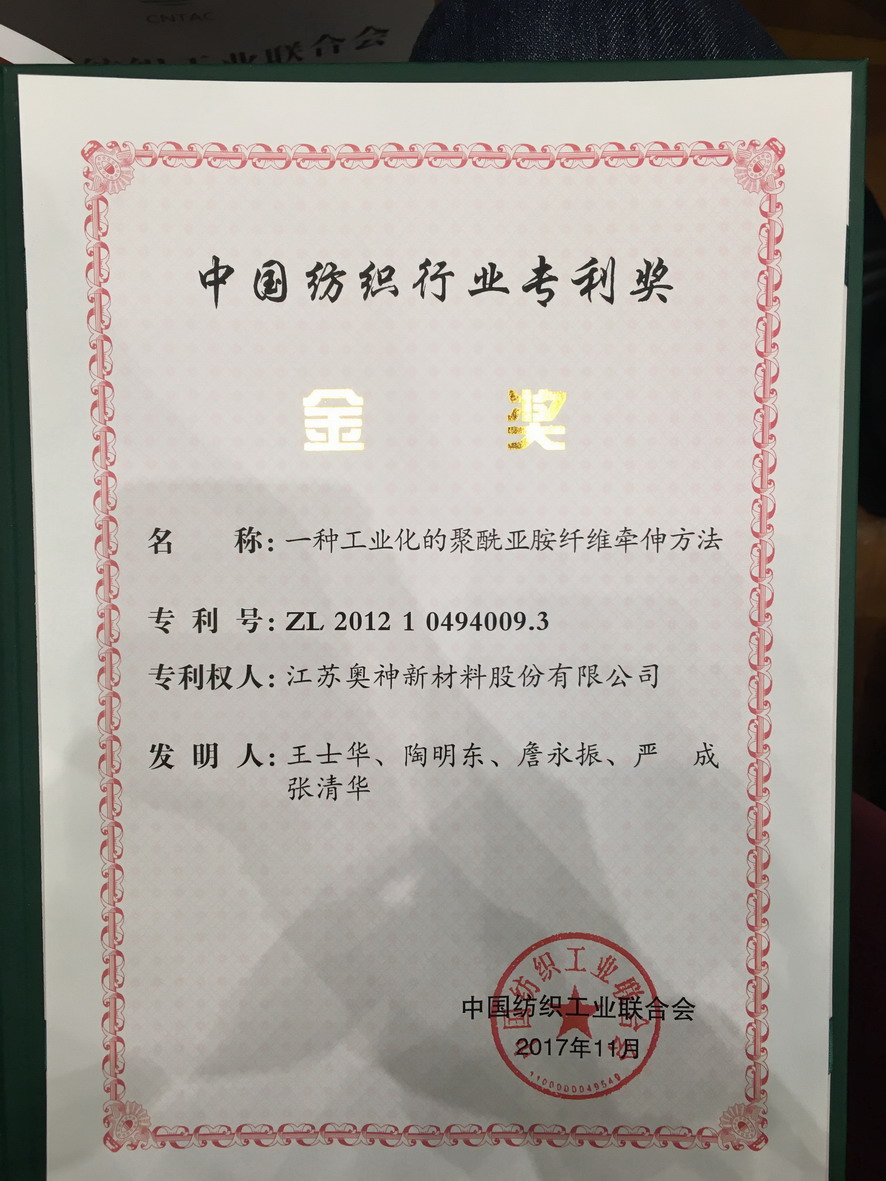會上發(fā)布了首屆中國紡織行業(yè)專利獎、全國紡織科技創(chuàng)新人才等評審結(jié)果,集團(tuán)公司副總經(jīng)理王士華獲得“全國紡織科技創(chuàng)新領(lǐng)軍人才”榮譽稱號,并作為獲獎代表上臺發(fā)言。江蘇奧神新材料股份有限公司發(fā)明專利“一種工業(yè)化的聚酰亞胺纖維牽伸方法”獲得首屆中國紡織行業(yè)專利獎金獎。
