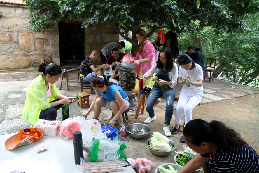 這處清幽潔凈的農(nóng)家小院成了隊(duì)員大展廚藝的用武之地,大家迅速整理好自帶的蔬菜食物,按各自特長(zhǎng)分好工。有清理蔬菜的、有和面的、有刷鍋燒水的,那些實(shí)在幫不上忙的便湊到一起圍坐在院中的樹蔭下開始“摜蛋”比賽。廚房中,面對(duì)農(nóng)戶家中的那兩口大草鍋,負(fù)責(zé)炒菜的隊(duì)員直撓頭,因?yàn)樵诔抢飳?shí)在是無(wú)處尋覓這樣的鍋灶了,更不知該如何才能把這灶火燒得旺旺的。這時(shí)我們的女隊(duì)員劉惠自告奮勇,勇敢地?fù)?dān)起了“伙頭軍”的重任。還別說,在經(jīng)過戶主老大爺?shù)囊环更c(diǎn)后,一會(huì)兒功夫這灶火便被她燒得有規(guī)有距起來。很快,灶房便飄出了炒肉、煎蛋的香味。此時(shí),院中也已擺起了包旱餃的陣式來了。面已和好,兩種口味的餡料也已備好。有負(fù)責(zé)搟餃子皮的,有負(fù)責(zé)包餃子的,隊(duì)員們賽速度、賽質(zhì)量,兩種口味的餃子被分別擺放在各自的簸箕里??粗螒B(tài)各異的餃子,大家忍不住評(píng)價(jià)起來,最終有隊(duì)員被冠上了“專業(yè)面點(diǎn)師”的雅號(hào)。人多力量大,當(dāng)所有的菜肴、面點(diǎn)擺到長(zhǎng)桌上時(shí),大家開心不已,雖然這算不上美味佳肴,但自己的勞動(dòng)果實(shí)卻總是最美味。