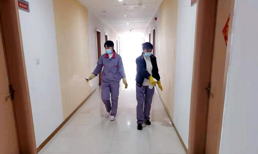 干凈整潔的辦公樓、宿舍樓里飄著淡淡的消毒水味道,清瘦干練的保潔員任禮勤正在仔細(xì)地打掃著樓道。5號疫情突發(fā)之時她正好當(dāng)班,根據(jù)以往疫情經(jīng)驗,她果斷地把一直照料著的年邁母親安排給了大哥,此后便堅守在工作崗位上。疫情防控期間的工作量增加了不少,每天她和同事們分片作業(yè),在認(rèn)真做好各自清潔區(qū)每日兩次的保潔、消毒工作的同時,還要負(fù)責(zé)就餐人員一日三餐的登記、測量體溫等工作。每天從早上7點開始,5位保潔員的身影便忙碌在公司的門廳、餐廳、樓道、電梯等場所,這一忙常常要到晚上6點多。“請您量下體溫”“今天你做核檢了嗎”,這些溫馨的話語幾乎成了她們對大家的問候語。