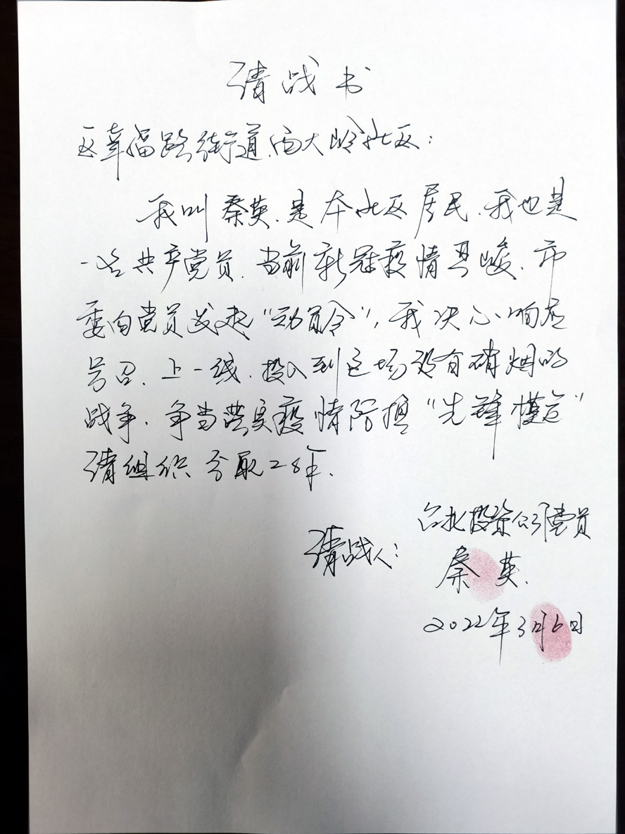 隨著市政府的快速響應,不到中午就開始全區(qū)核酸檢測,突地一下工作人員不夠用了?!耙咔榫褪敲睿揽鼐褪秦熑巍?,秦英主動聯系海州區(qū)幸福路街道西大嶺社區(qū),在咨詢志愿者報名的同時,鄭重地并向社區(qū)遞交了一份疫情防控“請戰(zhàn)書”。與此同時,她還動員她所在的“工投舞蹈隊”一幫姐妹,迅速成立一支抗疫志愿者隊伍,自發(fā)維護小區(qū)防控秩序,參與小區(qū)噴灑消毒、衛(wèi)生清掃、鄰居物資代購、心理疏導等工作中。幾千人的小區(qū)在她的感染帶動下,擰成一股繩、攥成一個拳,群防群控,筑起一道廣泛堅實的防疫戰(zhàn)線。