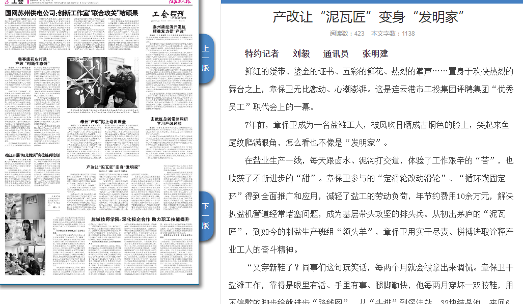 近年來,連云港市工投集團灌西公司為打通產(chǎn)業(yè)工人成長成才的身份壁壘、價值體現(xiàn)壁壘及學習教育壁壘,開辦技能培訓“大課堂”,打造“一中心+三基地”職業(yè)教育平臺,即金藍領技術工人培訓中心和技能比武基地、技術創(chuàng)新基地、技能鑒定基地,構建公司、單位和班組三級職業(yè)教育體系、技能培訓體系和技能評定體系,引導產(chǎn)業(yè)工人重在技能深耕、求精、拔尖、攀高上磨練塑造。章保衛(wèi)正是在技能培訓的“大課堂”中一步一步成長起來,他參與的“定時打鹵泵”、“管道輸送加壓法”、“低溫除硫工藝”等技術得到快速推廣,也讓他從普通員工成長為“二星級優(yōu)秀員工”,被推選擔任制鹽生產(chǎn)班組長,每月工資增長800元。這一切讓他獲得滿滿的榮譽感和幸福感。