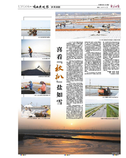 扒鹽現(xiàn)場,指揮生產(chǎn)的程龍是土生土長的“鹽三代”,爸爸和爺爺都是老鹽場人?!昂望}場打交道,心里才踏實?!贝髮W畢業(yè)后,在外地工作了幾年,程龍最終還是決定回到鹽場工作。程龍說,純手工扒鹽的年代,鹽工們都很辛苦——春季,鹽工們迎來“大忙”。他們需要防“地漏”,用石拱、壓割機把池底壓實,防止鹵水滲透下去。緊接著,就要忙春季扒鹽。夏季,鹽工們需要防“天漏”,提前將鹵水放進土塘,避免降雨將鹵水稀釋。秋季,鹽工們開始手工扒鹽,用扁擔挑鹵水,用小推車把曬好的鹽一車車推到船上運走。冬季,鹽工們需要對溝道、池埝、土塘進行修復(fù),為來年春天做準備。一年四季,循環(huán)往復(fù),鹽場人辛勤勞作。