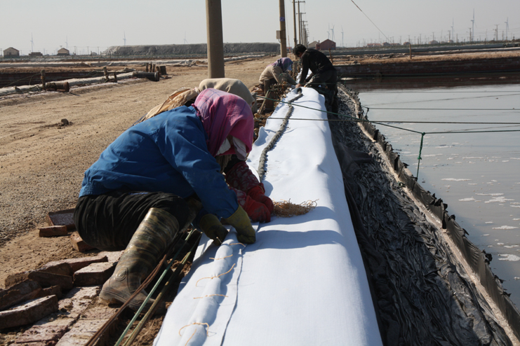 3月14日下午,風和日麗,在日曬制鹽公司廣闊的結晶生產(chǎn)區(qū),潔白的鹽廩、潔白的格堰在陽光照耀下,顯得格處醒目,只見工人們有的在扒鹽,有的在破碴,還有的在更換塑布......全公司上下一派大干場景。我們在新河制鹽分公司的八班一期生產(chǎn)區(qū),只見工人們兩人一組,蹲在池堰邊,用土工布固化格堰,進行灘場亮化,這一片區(qū)域是公司正在建設的食用原料海鹽生產(chǎn)基地。在一期與二期間的生產(chǎn)路上,我們遇到了該公司經(jīng)理安樹林,他正從南邊班組一路檢查走來,他告訴我們,自公司職代會召開過后,新河制鹽分公司通過支委會、班組會迅速傳達公司職代會精神,貫徹落實班組承包方案,對照全年產(chǎn)鹽55萬噸的目標,做好任務分解。當前鹽業(yè)生產(chǎn)積極做好破碴、活碴、更新塑布等工作,全力推進扒鹽工作,今年以來已經(jīng)扒鹽3.6萬噸。