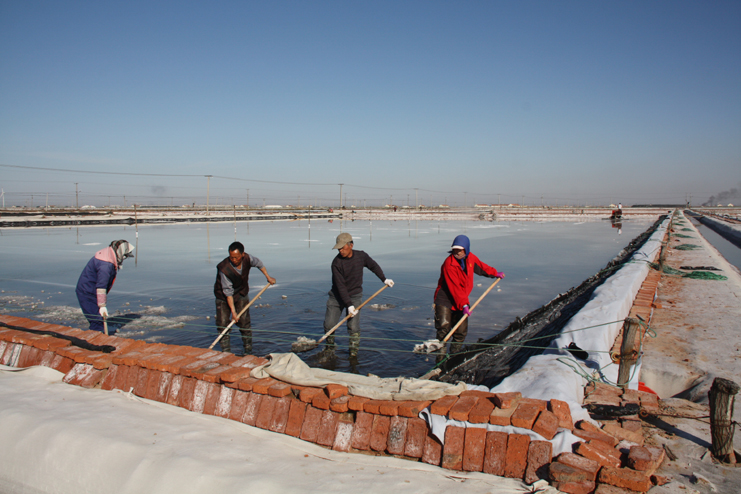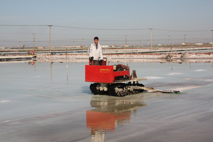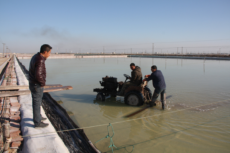 在埒南制鹽分公司的八班,我們看到一名工人正熟練操作著一臺整平機械在結晶池內(nèi)來回移動,對扒過鹽的格塊進行整平,還有幾名工人用鐵锨整平機械到不了的邊角地帶。由于在廩基上沒有看到鹽,而結晶池已扒過鹽,我們覺得奇怪,經(jīng)了解,原來今年新扒鹽已經(jīng)有部分銷售了出去。埒南制鹽分公司經(jīng)理楊守兵正在九班的灘上查看機械破碴情況,他說道:“我們以委員包片形式深入班組貫徹公司職代會精神,加強形勢任務宣傳統(tǒng)一思想,讓員工認識到當前原鹽市場回暖行情,鼓舞士氣,振奮精神,全力投入到當前春季生產(chǎn)中來。”