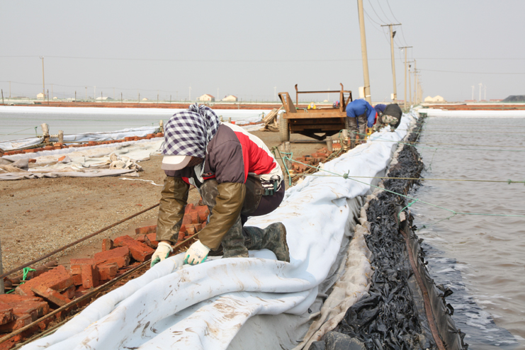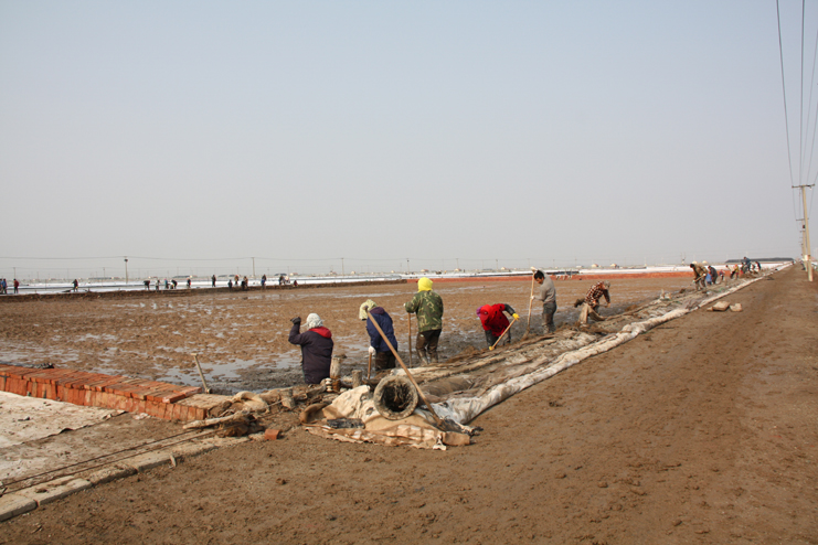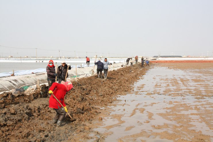 3月21日,在新河制鹽分公司八班的一期結(jié)晶區(qū),一片火熱景象,只見(jiàn)大家正在灘內(nèi)揮膀大干,挖泥的、和泥的、打堰的,配合密切,運(yùn)作熟練,參加勞動(dòng)的職工足有50余人。“為了加快食用原料海鹽基地建設(shè)進(jìn)度,今天,我們集中了7個(gè)組班的員工幫助八班維修下馬格格堰,爭(zhēng)取早日灌池生產(chǎn)。”正在工作現(xiàn)場(chǎng)安排工作的該公司經(jīng)理安樹(shù)林說(shuō)道。