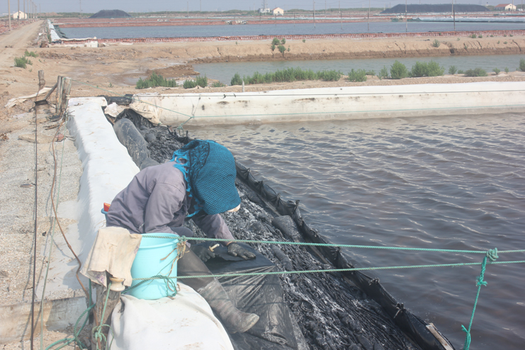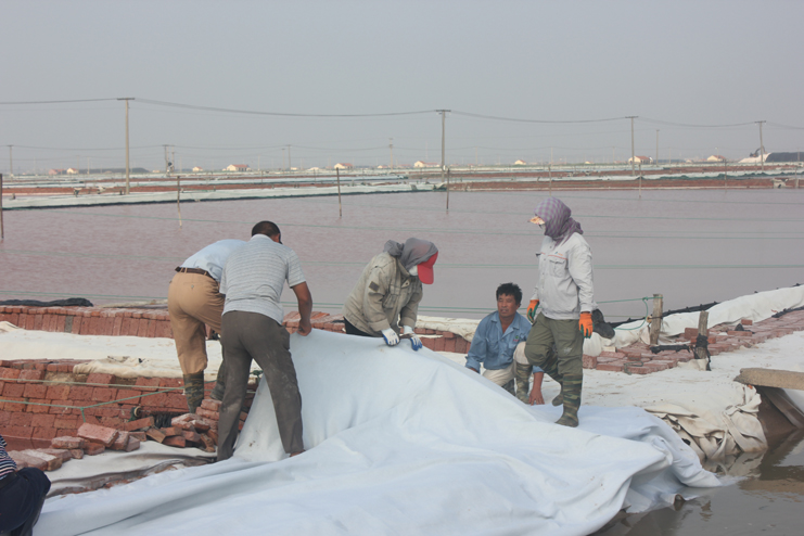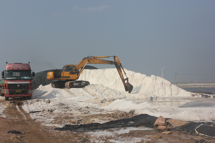 隨后我們又來到了新河制鹽分公司十四班的裝鹽現(xiàn)場。一位工人操作著挖掘機,往卡車上裝鹽銷售,如今裝鹽實現(xiàn)了機械化,工人的勞動負(fù)荷也減輕了許多。在埒南制鹽分公司的五班,我們看到七八個工人正在灘頭更換土工布,他們一字排開,先將土工布鋪開,然后分工合作,有的人負(fù)責(zé)把布理齊鋪平,有的則把磚頭鋪放在布上用來固化。