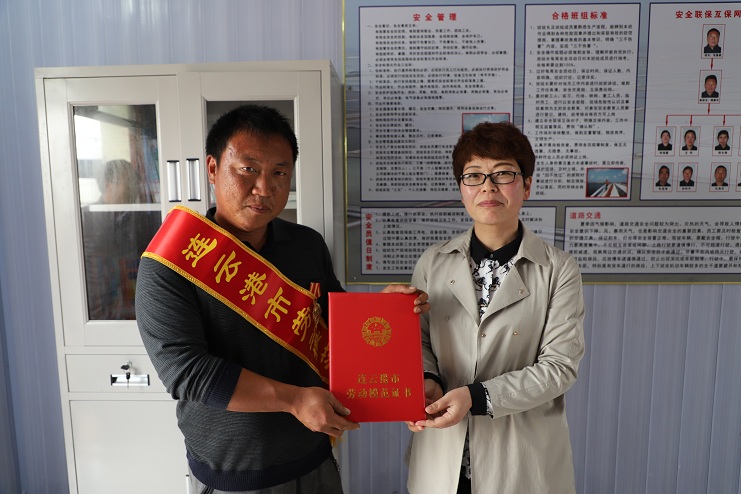 5月22日下午,公司董事長、黨委書記李國文、紀委書記、工會主席王宏一行到新河制鹽分公司八班為獲得連云港市勞動模范的祝星星綬帶佩章。
