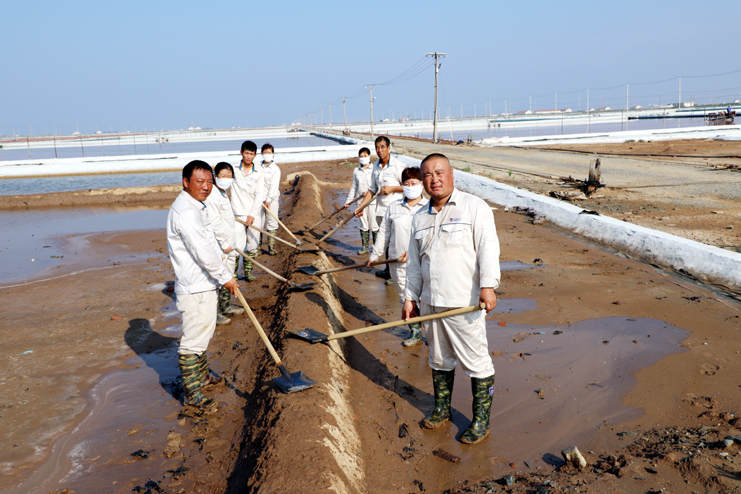 趁著休息的間隙,筆者與身邊忙得滿頭大汗的8班班長祝星星聊了起來。據(jù)祝星星介紹,每天員工4點半就到灘頭,進行鹽池的人工活碴、稟基修復、鹽池鹵水補充、收放設備檢查等一系列工作,因此,合理安排工作量非常重要。他告訴筆者,室外工作工人的勞保服比較厚,一天下來工作服濕了又干,干了又濕,衣服上都泛出厚厚的鹽漬。一天下來,全班要消耗2大桶甚至更多的飲用水?,F(xiàn)在公司里對我們一線生產(chǎn)崗位員工非常關心,防暑降溫工作非常到位。最近,單位又為我們發(fā)放高溫津貼、電風扇、防暑降溫藥品。這些讓我們員工真切感受到組織的力量,組織得偉大,所以雖說現(xiàn)在比平時更辛苦,我們有信心戰(zhàn)高溫、奪高產(chǎn)。