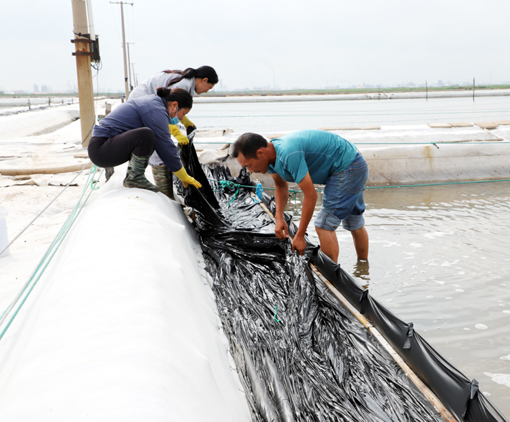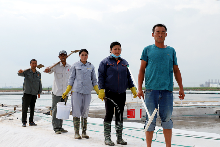 8月15日早,在制鹵區(qū)2班,班長(zhǎng)王春好帶著班組的工人準(zhǔn)備干活,安排好每個(gè)人的工作后,大家拿起工具上灘,工人們分散開來,各自忙著手里的活。工人們前后排開,彎腰俯身,用鐵鍬挖溝做堰,為下雨排淡水做好準(zhǔn)備。“踩在鹵水里能感覺像是在“燙腳”,太陽把鹵水曬的滾燙的。”領(lǐng)灘手王春好用衣袖擦著臉上的汗水說,自己在灘上干了有七、八年了,對(duì)于這樣的工作環(huán)境已經(jīng)適應(yīng)了。進(jìn)入八月以來,連續(xù)7天最高溫度達(dá)到35以上,臺(tái)風(fēng)過后,今天的氣溫也達(dá)到了33度,令今年這個(gè)夏天,成為有完整氣象記錄最熱的夏天。跑水工仇海濱,到灘上一個(gè)多小時(shí),以是大汗淋漓,他帶領(lǐng)工人做一些修堰、補(bǔ)塑布、緊繩、還有查跑道頭的活。
