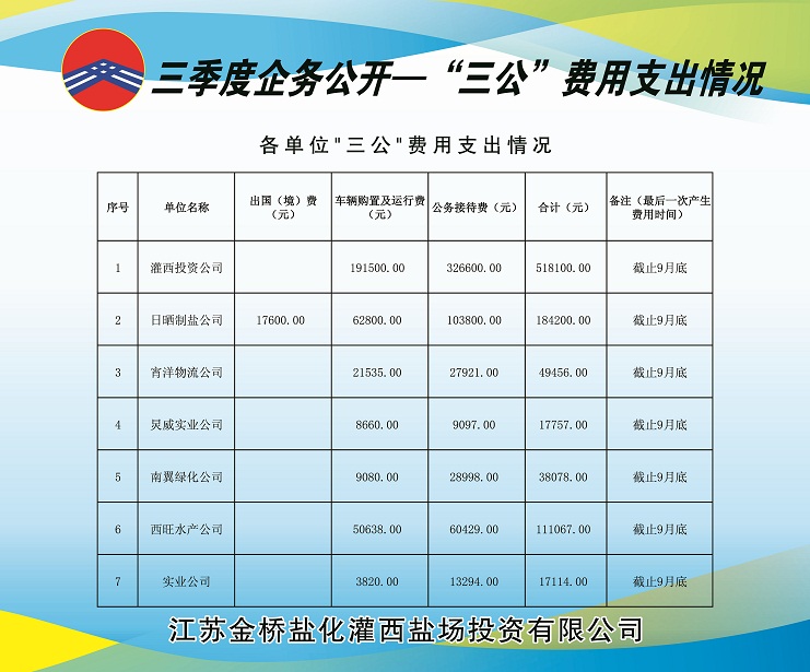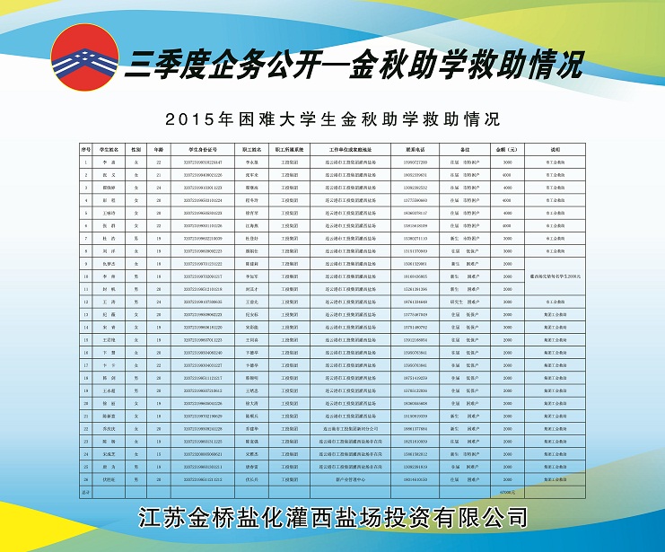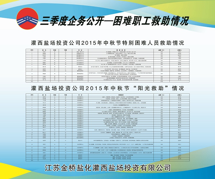 三季度,公司黨委積極做好走訪慰問、送溫曖工作,灌西鹽場投資公司、日曬制鹽公司對30名困職工發(fā)放陽光救助金30000元;對15名患重大疾病困職工及直系親屬發(fā)放救助金15000元;對26名困難大學(xué)生實行金秋助學(xué)金67000元。具體情況請查看公示展板。