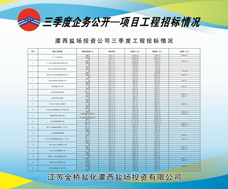 第三次是在8月12日,招標(biāo)項目是:1、阜頭圩水庫池塘簡易石子道路工程,中標(biāo)價為李建國35461.99元。2、廉政教育展廳裝修工程,中標(biāo)價為江蘇虹鑫裝飾有限公司61830.20元。3、機(jī)關(guān)新建籃球場工程,中標(biāo)價為南翼公司105841.03元。4、機(jī)柴門工區(qū)灘地機(jī)房修理(1~3班),中標(biāo)價為徐飛5869.21元。5、六圩閘渡槽閘板維修,中標(biāo)價為宋雅軍8739.92。6、柴門工區(qū)鈣液灘地機(jī)房修理(1~7班),中標(biāo)價為徐飛1583.76元。7、二灣3.4組石子道路修補工程,中標(biāo)價為宋雅軍27973.32元