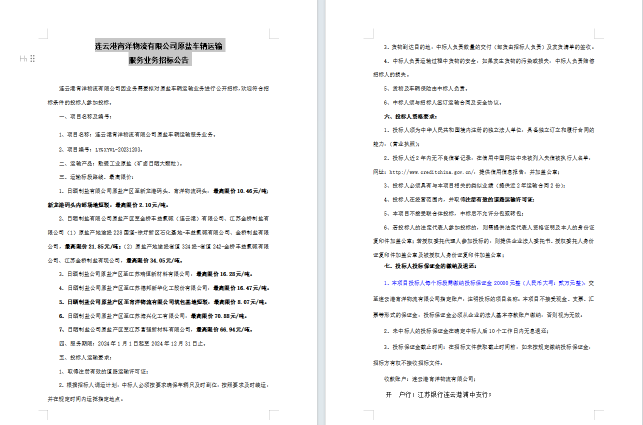 連云港宵洋物流有限公司原鹽車輛運輸服務業(yè)務招標公告