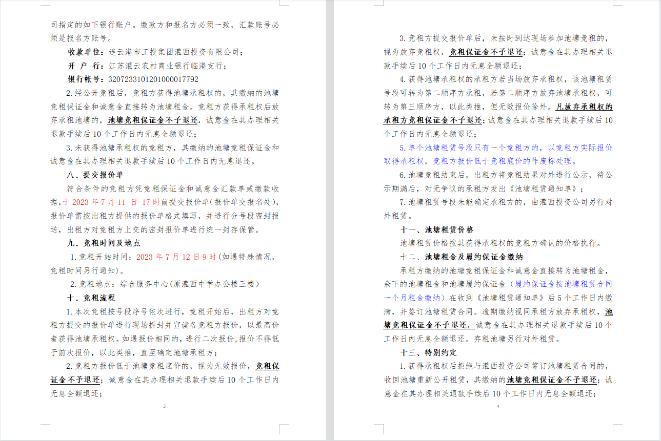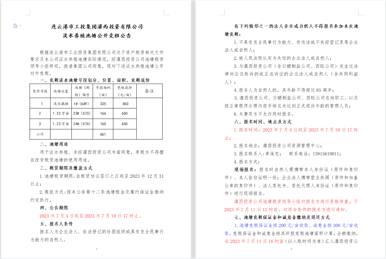 連云港市工投集團(tuán)灌西投資有限公司淡水養(yǎng)殖池塘公開競租公告