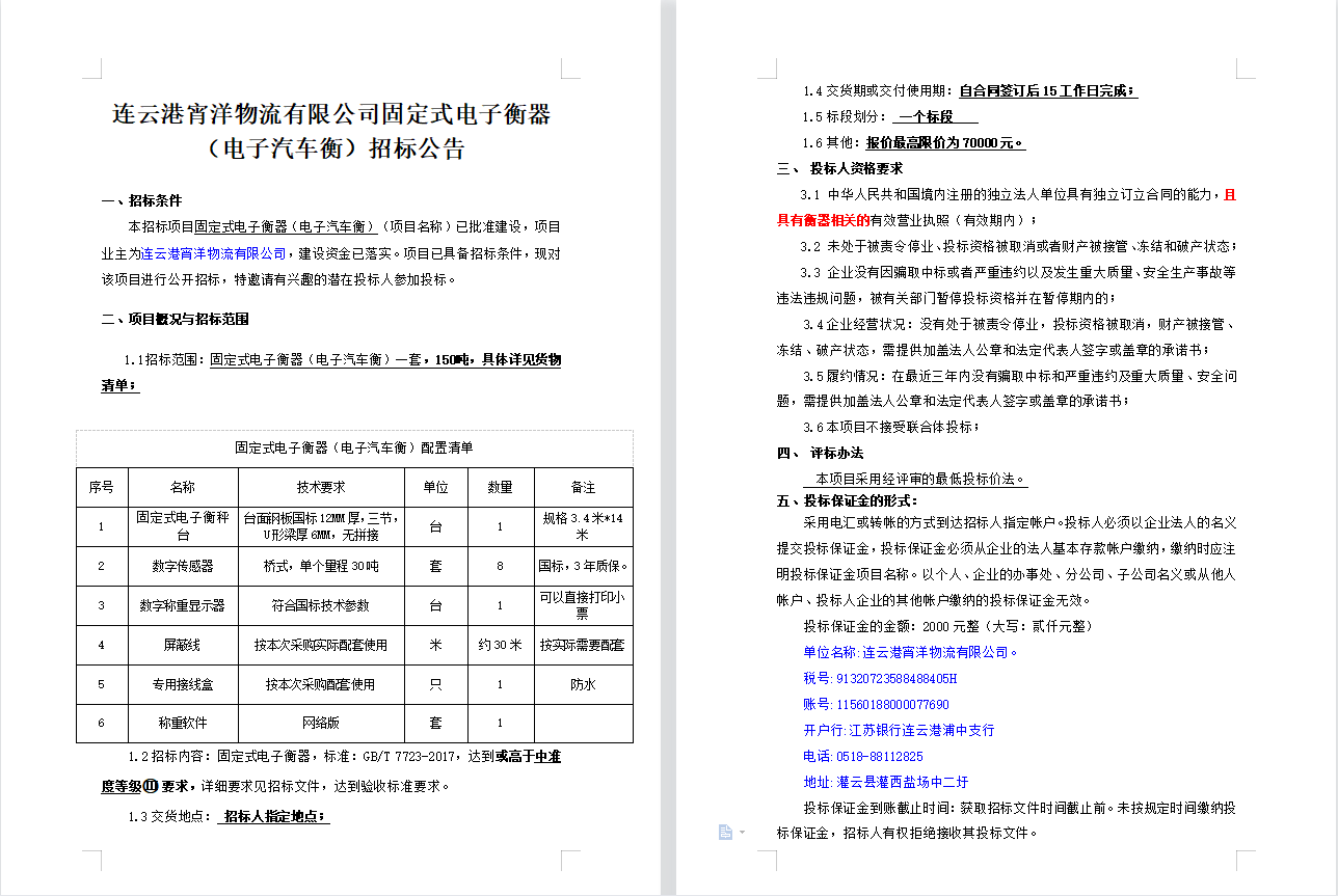 連云港宵洋物流有限公司固定式電子衡器(電子汽車衡)招標公告