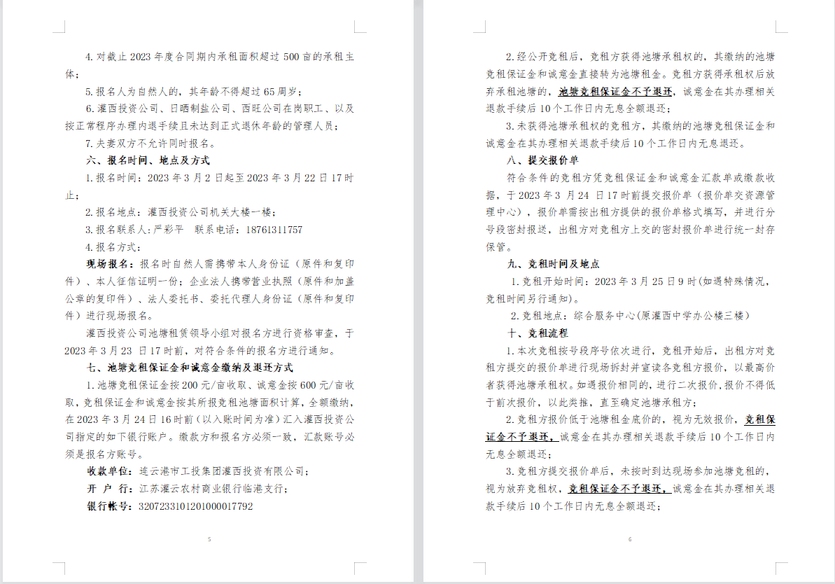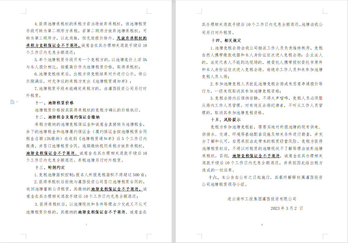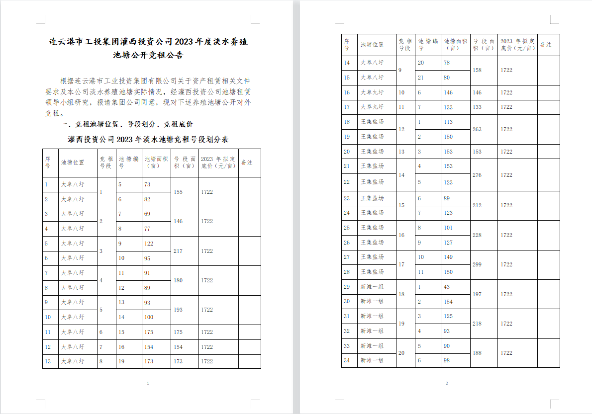 連云港市工投集團(tuán)灌西投資公司2023年度淡水養(yǎng)殖池塘公開(kāi)競(jìng)租公告