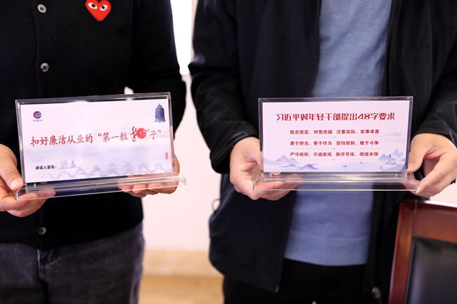 ? ? ? ?會后,公司紀委為10名新提拔干部發(fā)放了廉潔承諾桌牌,提醒他們常把“廉”字記心間,扣好廉潔從業(yè)的“第一??圩印?。(青紀)