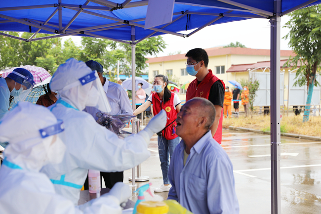“黨旗飄在一線、堡壘筑在一線、黨員沖在一線”。核酸檢測現(xiàn)場,來自青口公司黨員志愿者在現(xiàn)場為職工群眾提供相關(guān)咨詢和掃碼指導(dǎo)服務(wù),很多黨員在核檢工作中全身濕透仍在雨中盡力維護秩序,盡管天氣不作美,但是職工群眾依然按工作人員的指導(dǎo)有序地進行核酸檢測。大雨里,黨員紅、醫(yī)護白顯得格外耀眼。(仲偉彬)