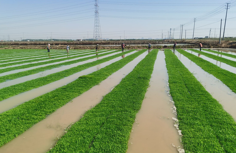 近日,大新農(nóng)場自營農(nóng)田機(jī)插秧苗已全部揭開無紡布,秧苗整體長勢較好,一片綠意盎然。目前播種較早的秧苗苗齡在三葉一心。(劉 楊)