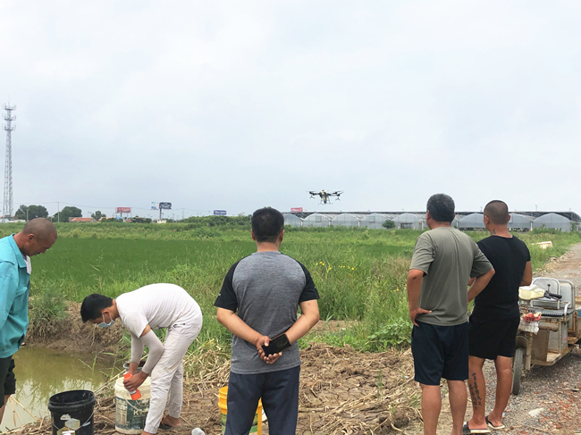 拿起遙控傳感器,把控路線,按下起飛按鈕,無人機按照操控徐徐升起,平穩(wěn)地向稻地飛去。幾分鐘后掉頭飛回,折返噴灑,規(guī)律地重復(fù)……隨著螺旋槳的轉(zhuǎn)動,機身下的噴淋頭噴出霧化農(nóng)藥,均勻地噴灑在油綠的水稻上。