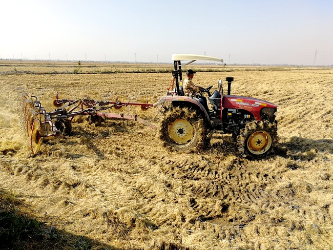 為有效防止秸稈焚燒形成的污染,保護(hù)生態(tài)環(huán)境,促進(jìn)秸稈綜合利用。日前,大新農(nóng)場在水稻收割的同時積極聯(lián)系秸稈回收廠家,對水稻秸稈進(jìn)行回收打包。稻田里,帶有八個圓形大齒輪的水稻摟草機(jī)正在工作,機(jī)器行駛在收割完的稻田中,將聚攏后的秸稈進(jìn)行打捆作業(yè),所過之處水稻秸稈被卷起,變成從機(jī)械后面“吐”出的一個個圓形稻草捆。通過秸稈回收,將大大降低秸稈焚燒安全隱患和環(huán)境污染問題。 (大新農(nóng)場)