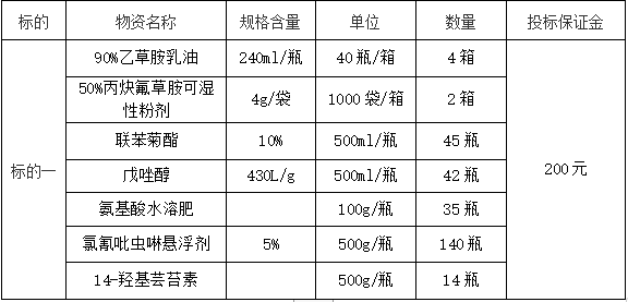 3.原則上由投標(biāo)單位按貨物需求進(jìn)行投標(biāo),若規(guī)格不符,投標(biāo)單位也可以根據(jù)自有包裝規(guī)格進(jìn)行投標(biāo)。本次招標(biāo)采購,確定生產(chǎn)廠家或代理商、農(nóng)藥品種、規(guī)格、劑型和農(nóng)藥單價(jià)。