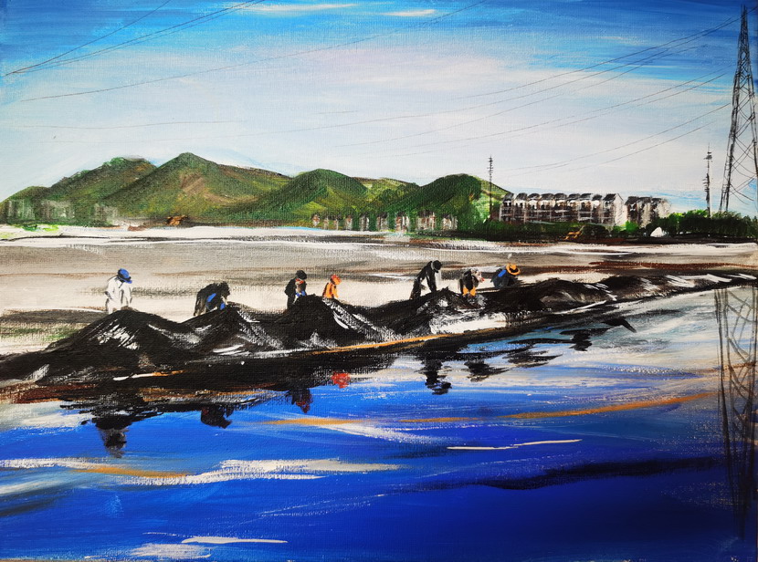 在這個屬于黨員的節(jié)日,我們脫下華麗的衣裳,全副裝備到達(dá)東灘,男同事們穿上水靴拿起鐵锨下到溝里,溝里淤泥已經(jīng)漫過了腿肚,女同事三五成群撿垃圾,抬浮板……背灼炎天光,力盡不知熱,在火熱的太陽下,我們頂著一身如雨的汗水,只為能在熱火朝天的奮斗中,給彼此一份清涼的懷念。
