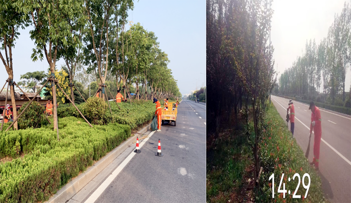 為提高工作效率,該分公司綠化班組在云港路、祥和路核心區(qū)域,采取人機(jī)結(jié)合方式,兵分4路同步推進(jìn)“秋剪”作業(yè)。既:1路,班長帶領(lǐng)工人負(fù)責(zé)對道路中間球類修剪造型。植物相對茂盛,腳下視野遮擋,工人舉著機(jī)器,一步一步往前推進(jìn)作業(yè)。2路,負(fù)責(zé)對道路兩側(cè)色帶綠籬安排修剪,及時(shí)清理枯樹枝和雜草保持綠化帶干凈整潔。3路,綠化帶內(nèi)高凹不平雜草遮住視野,作業(yè)有點(diǎn)難度,在安全員的帶領(lǐng)下用割灌機(jī)負(fù)責(zé)對道路兩側(cè)密集的雜草進(jìn)行清理作業(yè)。4路,用掃把和網(wǎng)兜清掃前面一組剪掉的碎葉,保障道路整潔暢通。
